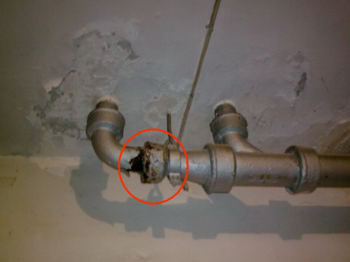 3、先把铸铁管拿铸铁焊条改成立式朝向下水,接着在后接管件顶端预置一个接头,再把自家下水的PVC管接到接头里面,把此接头朝着自家下水的窟窿,之后在铸铁接头内,PVC管周遭打上防水腻子,最后抹上防水胶即可。
